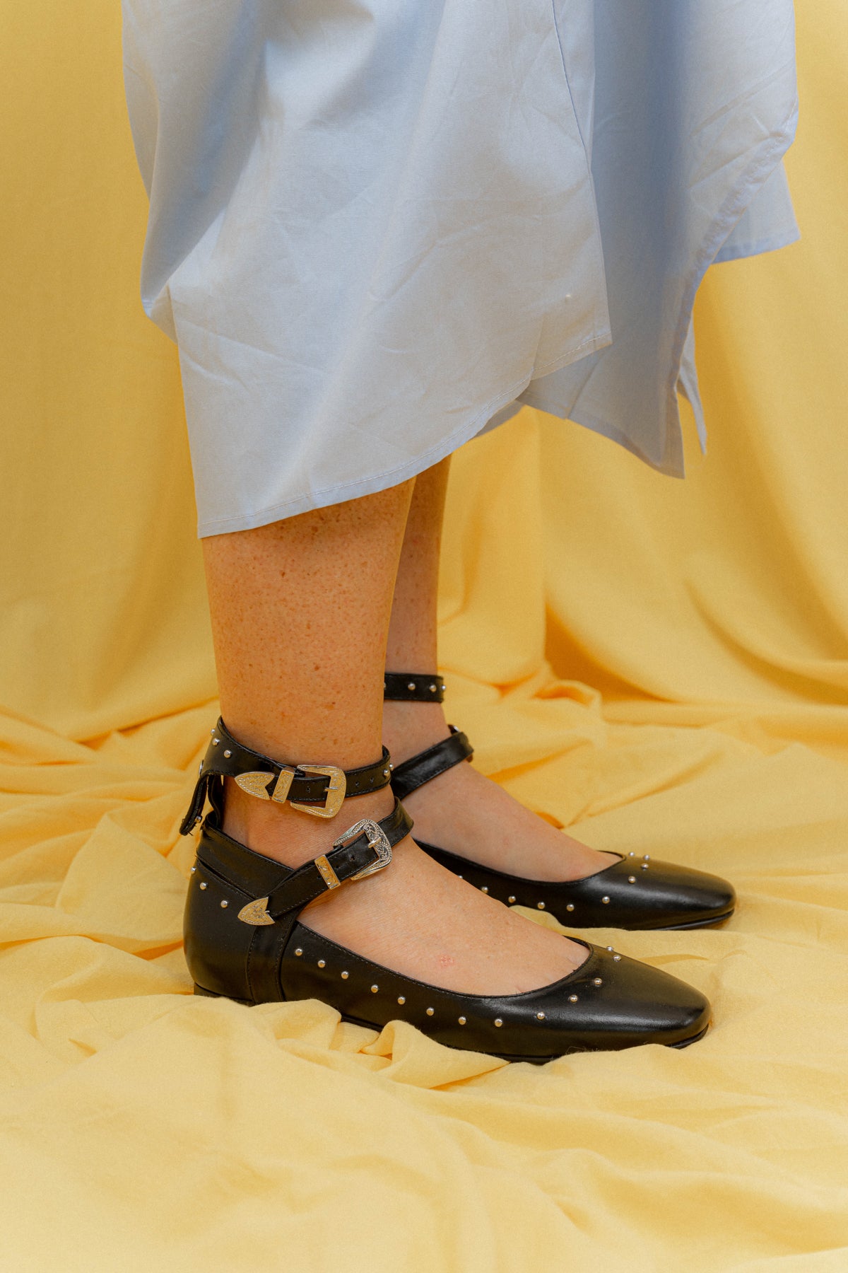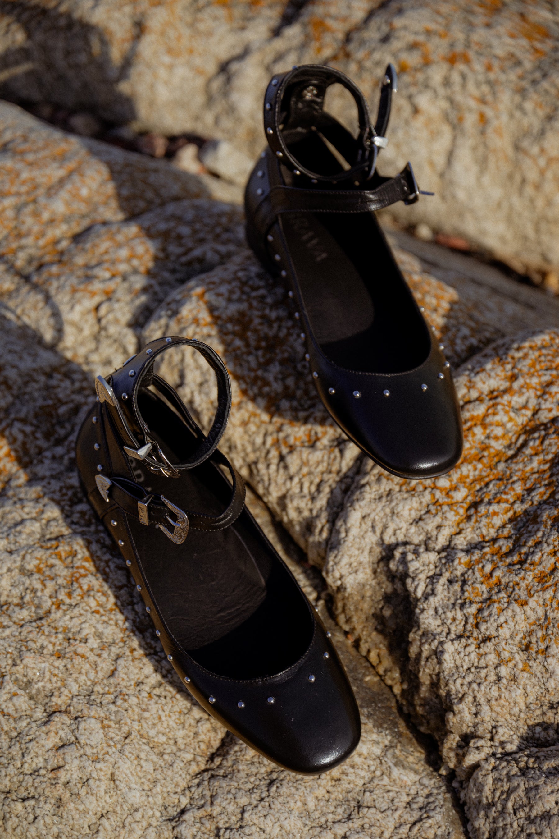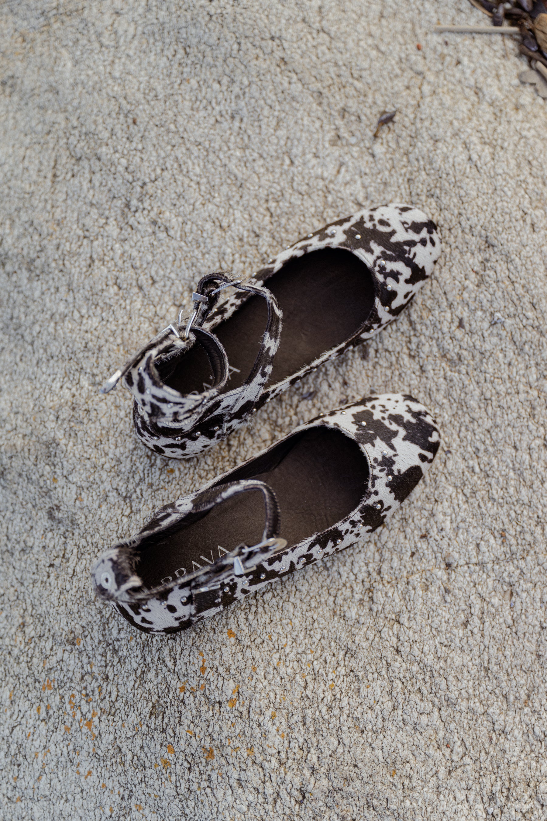 Dos estilos, una actitud: las balerinas HORTENCIA llegaron para darle fuerza y personalidad a tu look. Con un diseño que mezcla rebeldía y romanticismo, se destacan por su doble pulsera con hebillas plateadas labradas y detalles de tachas en el frente. Vienen en dos versiones: 100% cuero negro o con estampa cow en pelo natural. Perfectas para levantar cualquier outfit con un toque distinto.