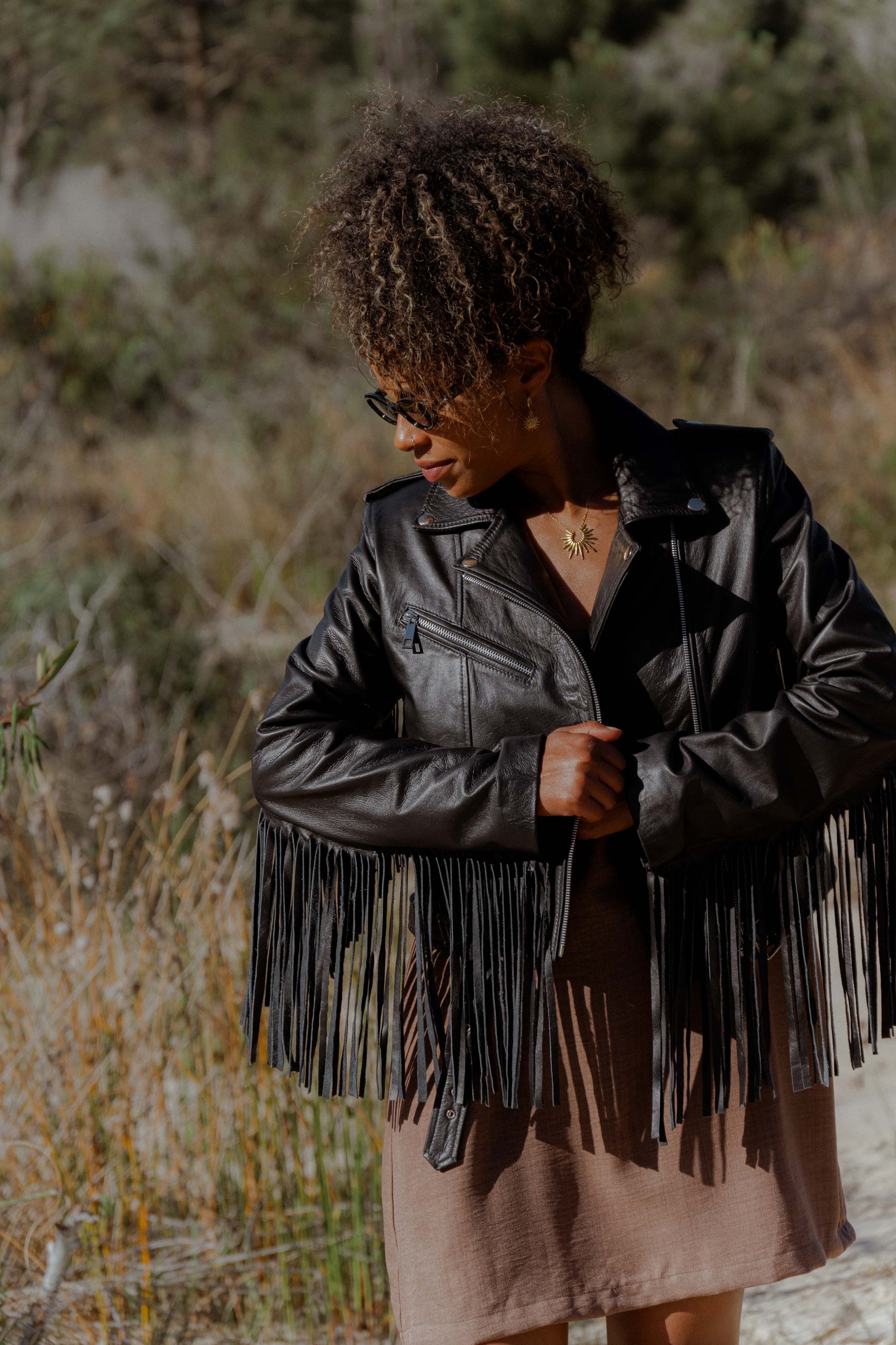 Confeccionada en cuero, con flecos largos que acompañan cada movimiento, es una prenda que te invita a fluir, a jugar, a expresarte sin esfuerzo. Combina increíble con vestidos sueltos, como en la foto, con jeans clásicos o con botas para un look aún más contundente.