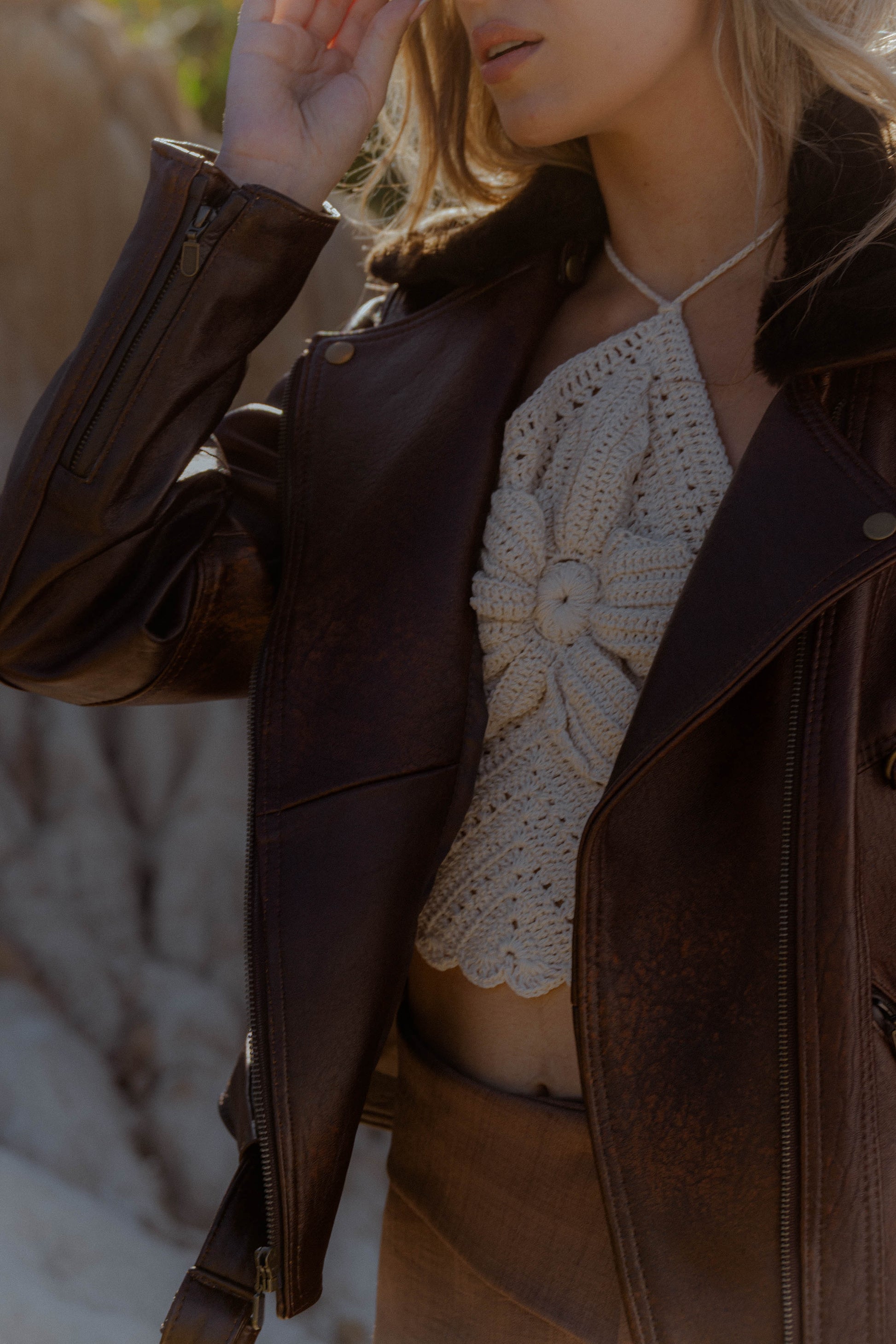 Diseñada a partir del clásico estilo aviador, pero reinterpretada con el ADN BRAVA, está confeccionada en cuero con acabado vintage, logrando una textura visual única que suma personalidad a cualquier look. Su calce a la cintura, el cinto ajustable y sus avíos en bronce viejo realzan tu figura y elevan instantáneamente tu presencia.