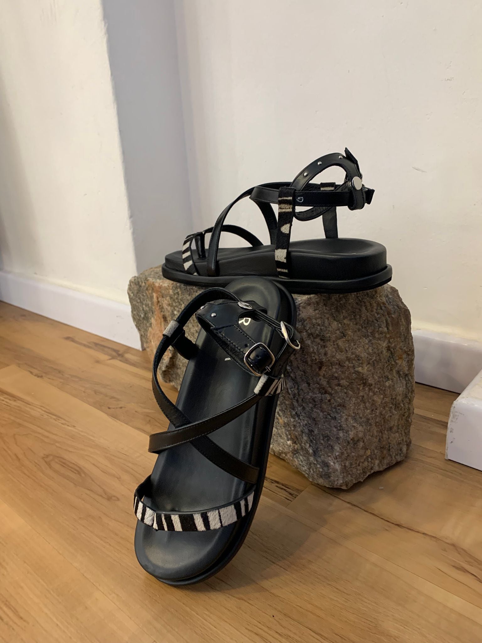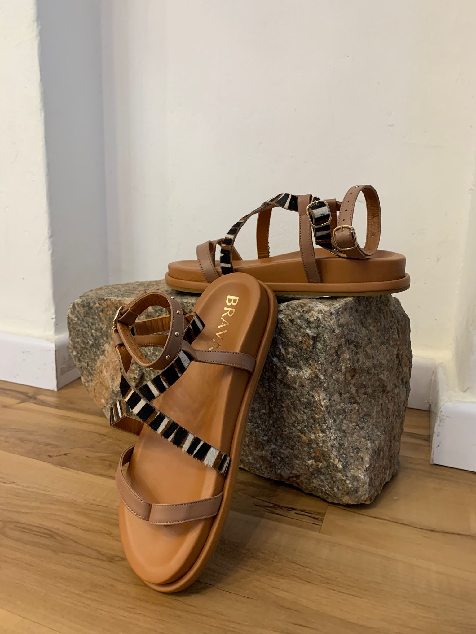 Inspiradas en la frescura del verano y los detalles que marcan la diferencia, las sandalias VARZEA combinan tiras de cuero con detalles en pelo animal print que realzan cualquier outfit. Su diseño con múltiples correas asegura el pie de manera cómoda y firme, mientras que la base acolchada garantiza confort en cada paso. Disponibles en dos tonos para adaptarse a tu estilo: negro con zebra y suela marrón con animal print estilo zebra a tono.