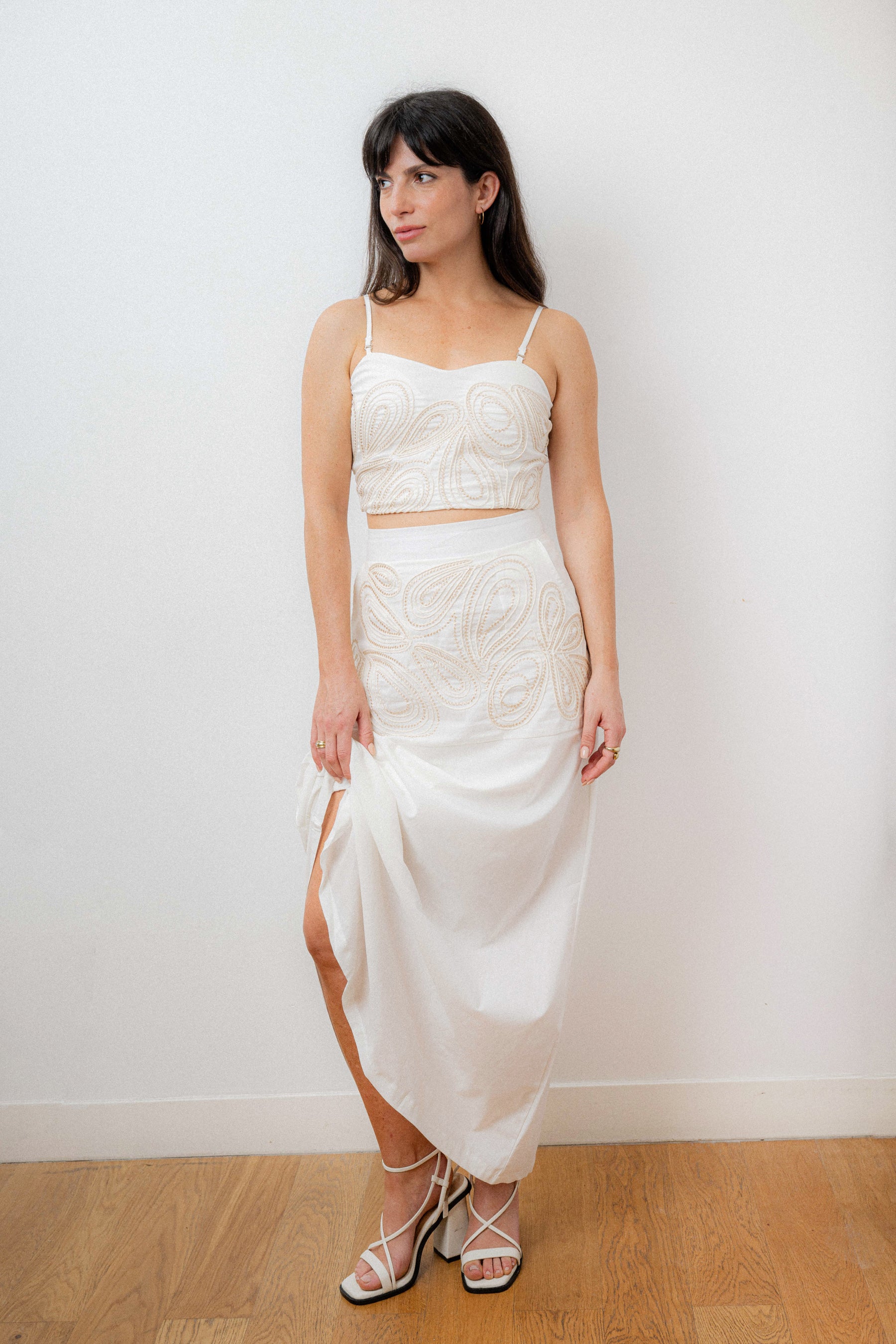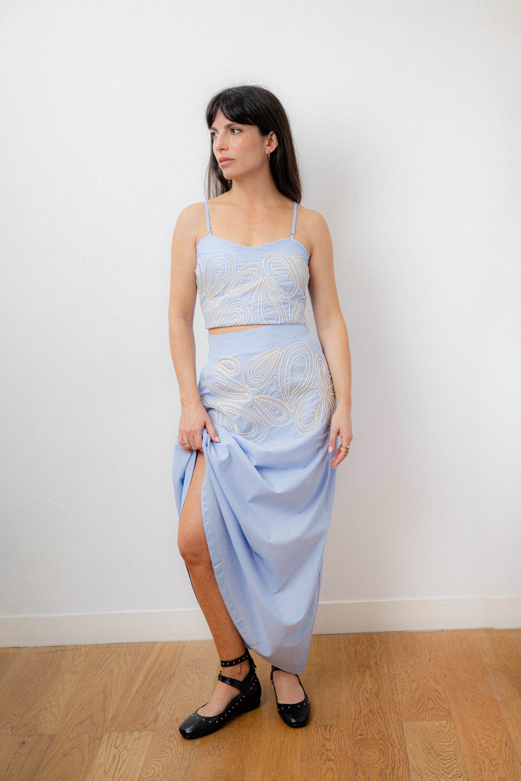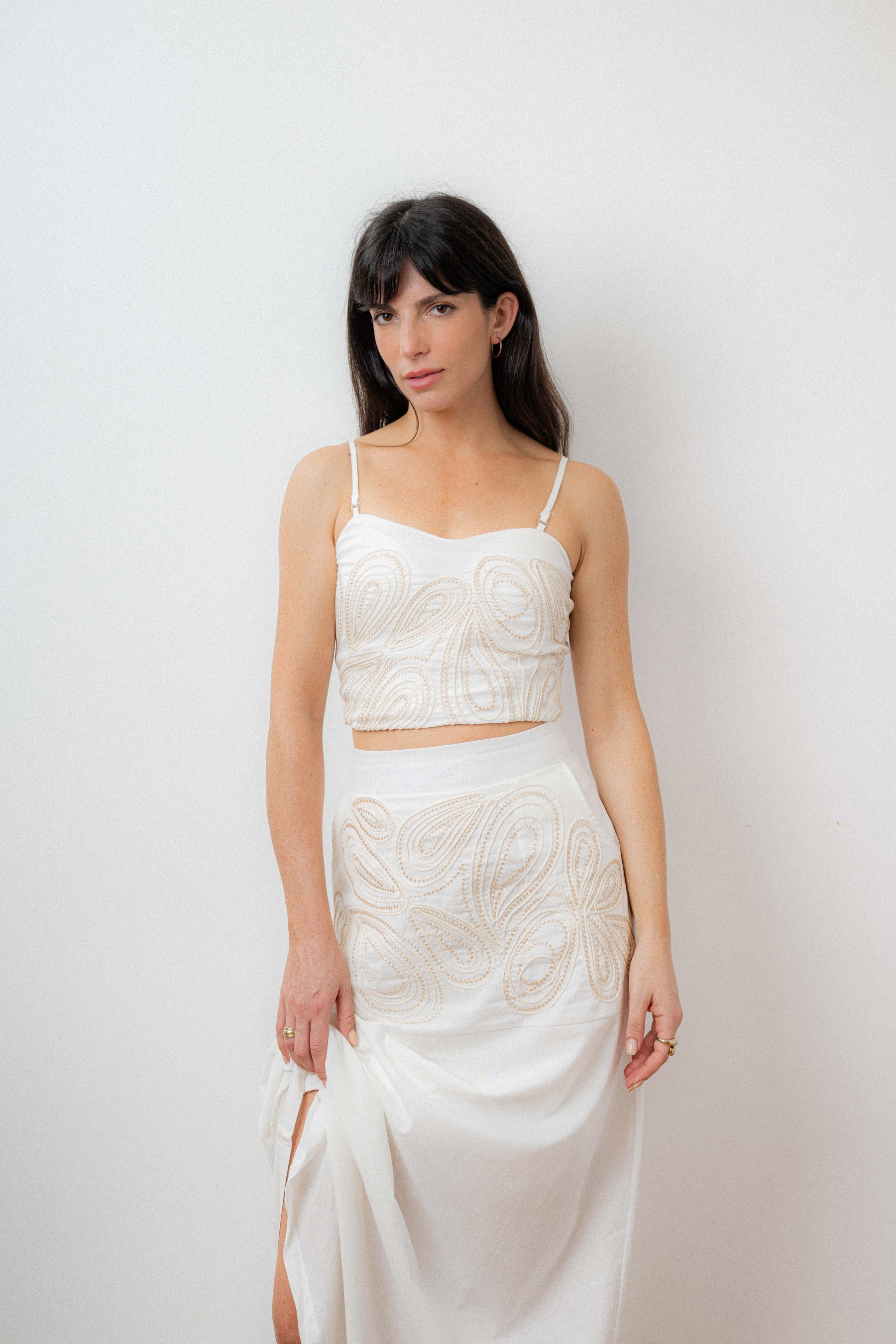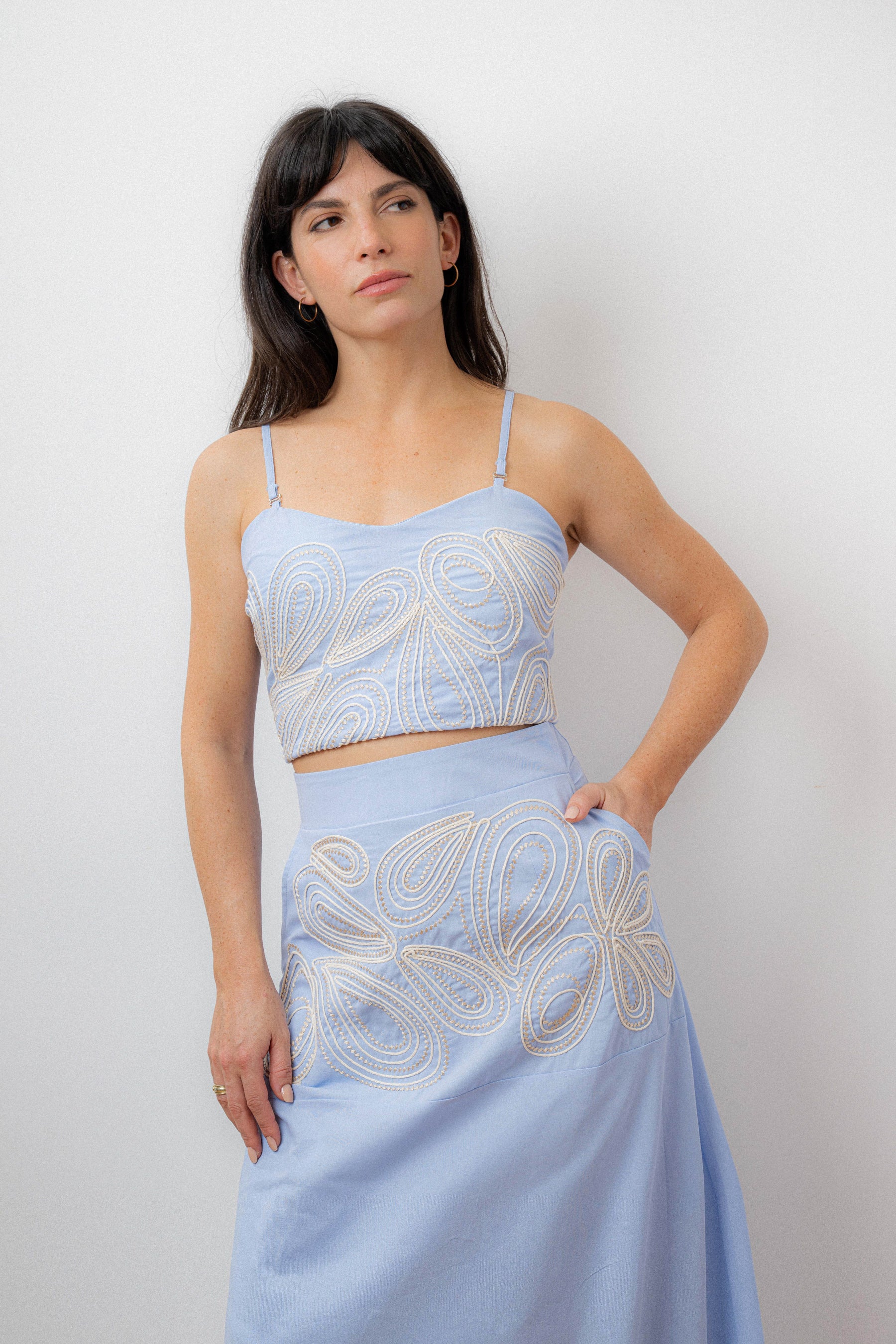 El Set AFLORA es sinónimo de frescura y encanto natural. Confeccionado en tela liviana y delicada, combina un top corto con breteles finos y una falda midi con tajo lateral, ambos realzados con un bordado artesanal en diseño orgánico que lo hace único. Disponible en blanco y celeste, es ese conjunto versátil que se adapta tanto a un evento especial como a un look relajado pero sofisticado.