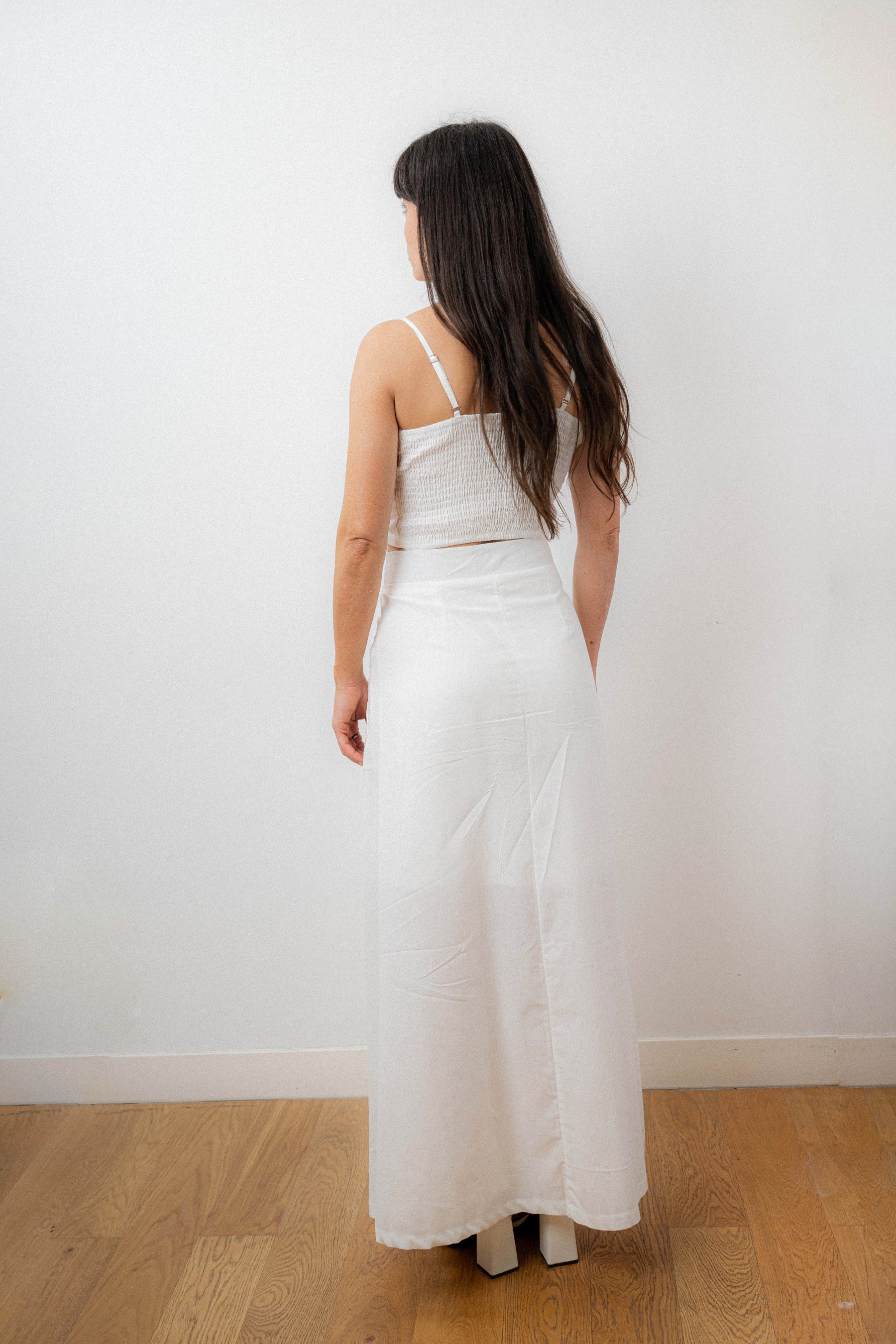 Llévalo con sandalias de tiras o con ballerinas para un aire más casual. También podés usar las piezas por separado: el top con jeans wide leg y la falda con una camisa oversize, creando múltiples opciones de look.