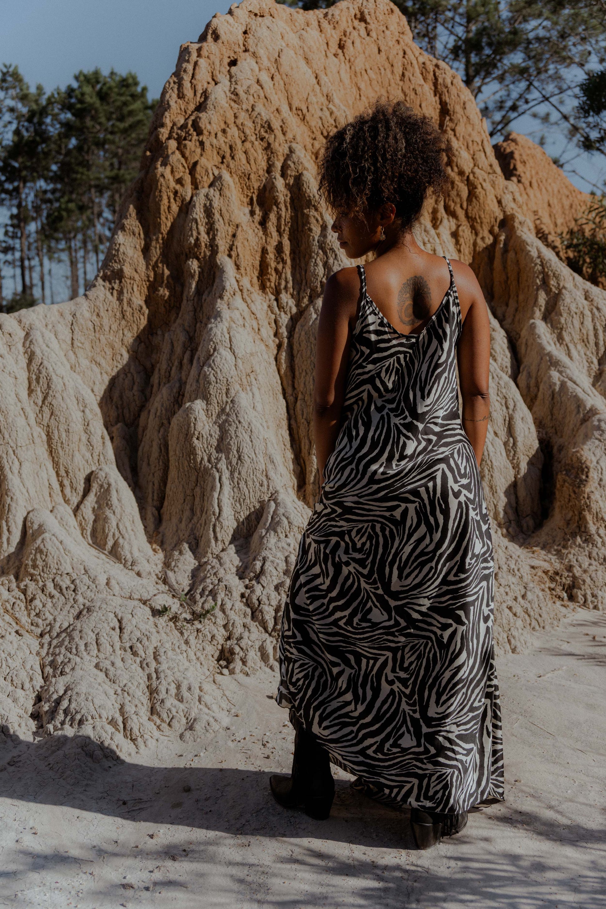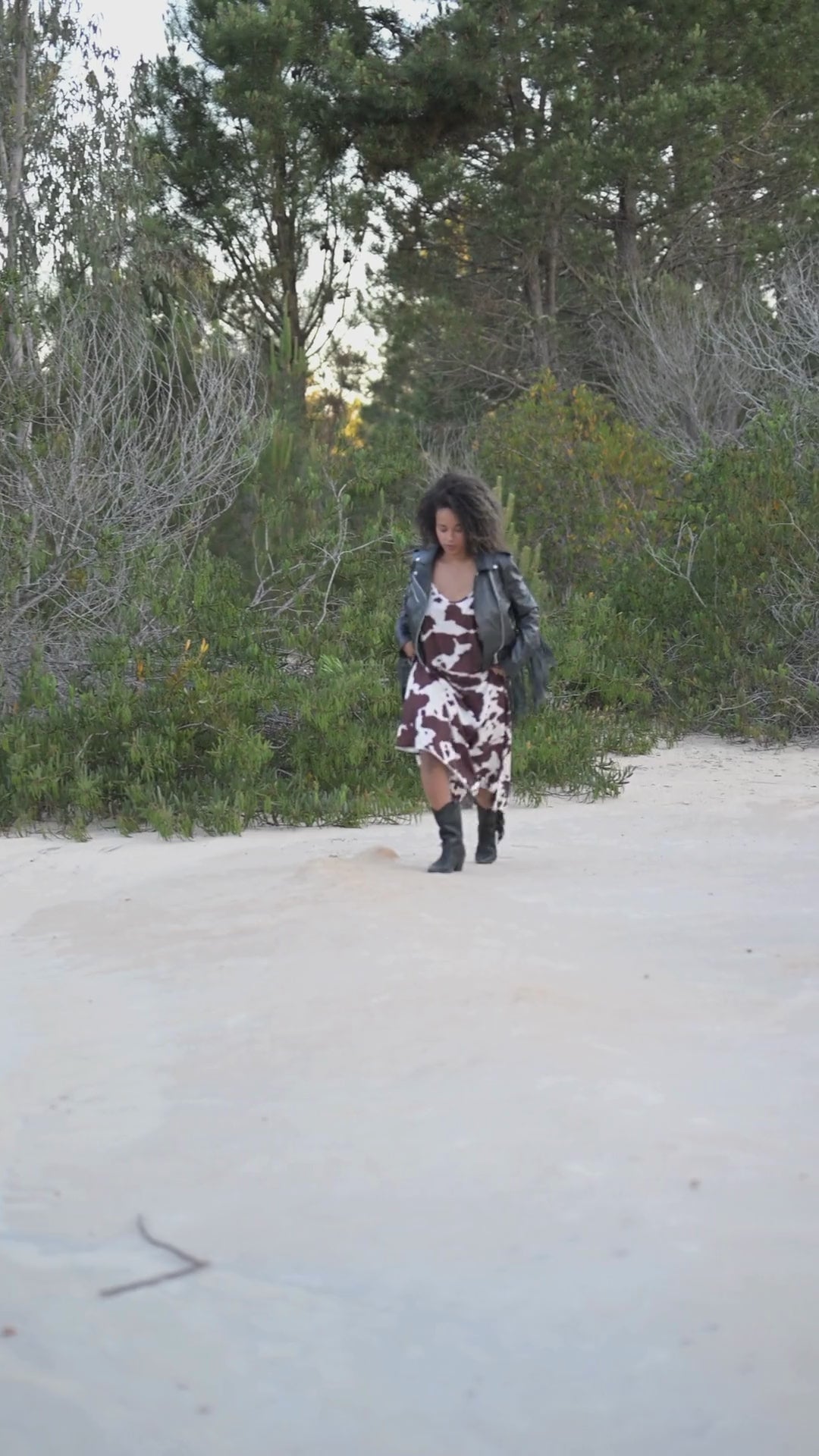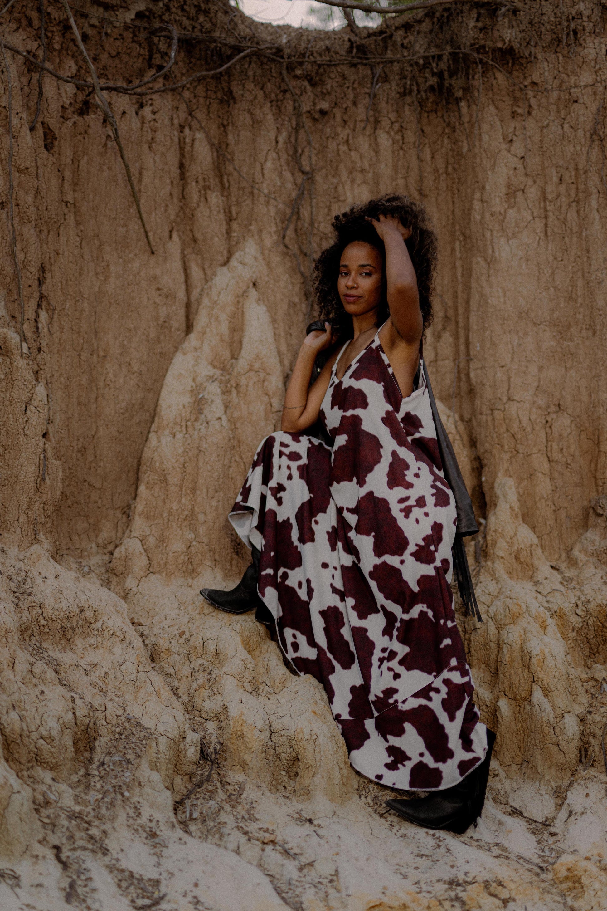 La estampa animal —en opciones cebra, leopardo y vaca— aporta personalidad instantánea. Un vestido versátil que funciona de día con zapatillas y campera de jean, y se transforma para la noche con tacos, botas o accesorios que lo llevan a otro nivel.